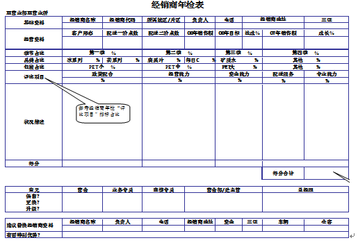 ② 组长及业代对所辖区域经销商的年度销售额、各品类销售情况、仓储、配送、经营理念及配合度、人员配备、销售网络、资金等情况进行综合考虑,并深入了解经销商下一年的资金、车辆、仓储、人员等情况,为对经销商进行评估准备基础资料。