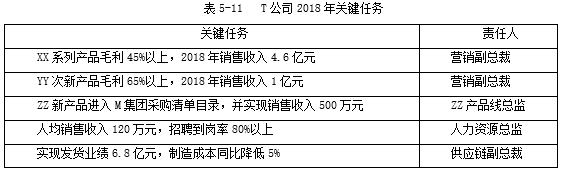 然后,我们根据掌握的相关信息,将T公司2018年经营目标初步分解为关键任务,见表5-11。