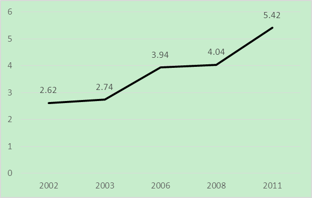 华为虚拟受限股的价值按照每股净资产计算,从2002年到2011年,每股净资产增长了一倍,华为的股权激励效果由此可见。2011年以后,考虑到新的配股给员工带来的资金压力,每股虚拟受限股的价格一直维持在5.42元。如图6-15所示。