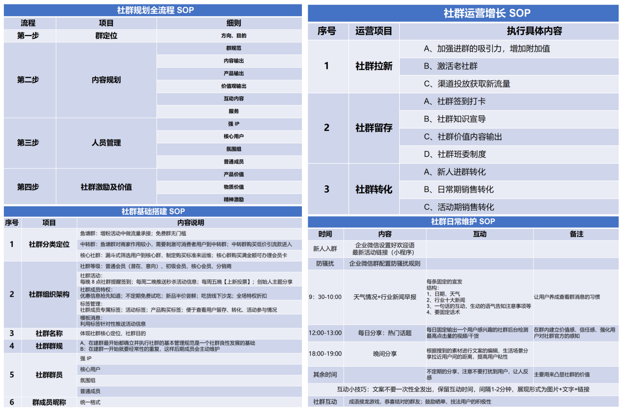 我们在具体执行社群运营的时候,正是围绕这个5个表格开展工作。运营人也非常清楚,什么时候该做什么事情,做的每一件事背后代表的意义和目的是什么。所以,通过SOP流程的梳理和制定,可以保证我们的社群运营策略能够高效落地。