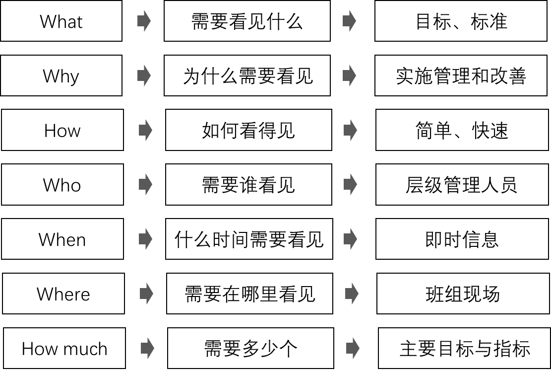 看得见的管理要从哪几个方面去思考,什么需要看的见,应该用5W2H的方式进行呈现,工厂需要在对应的区域设立各种各样的管理看板,让全公司的员工都可以通过这些管理看板得到想要的信息,进而推广这种看得见的管理,因为看不见就容易滋生问题和异常,使我们的团队产生这种管理惰性。