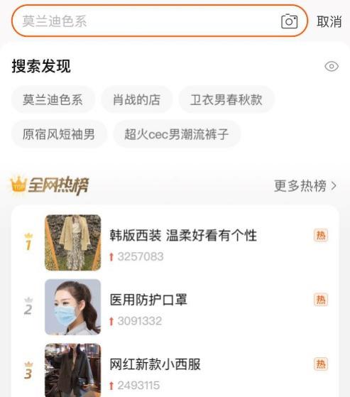 (一)搜索栏,用户使用搜索栏快速找到心仪的商品。(快速定位商品,应用个性化搜索)