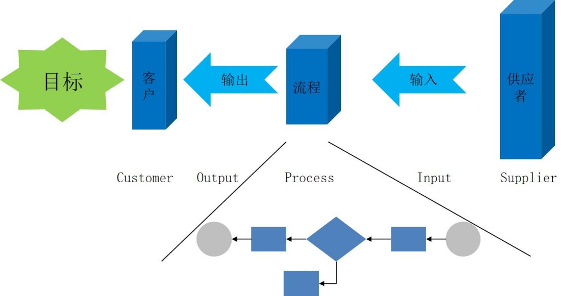 在传统的观念中,关于流程的描述,以美国质量管理大师戴明(William Edwards Deming,威廉·爱德华兹·戴明)提出的SIPOC模型影响至深。如下图所示: