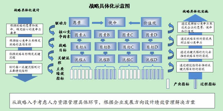 换句话说,他们的逻辑是首先必须依据战略的愿景和使命确定组织的核心竞争力要素,然后依据核心竞争力来确定战略的具体目标,在目标之下形成完成目标的关键流程,然后基于流程落实到具体的岗位和具体的绩效指标上。通过绩效指标的实现来推动关键流程目标的实现,通过流程的作用推动战略目标的实现,进而树立核心竞争力,最终达成企业的愿景、使命和价值观。他们把这称之为战略具体化设计和战略具体化实施的过程。