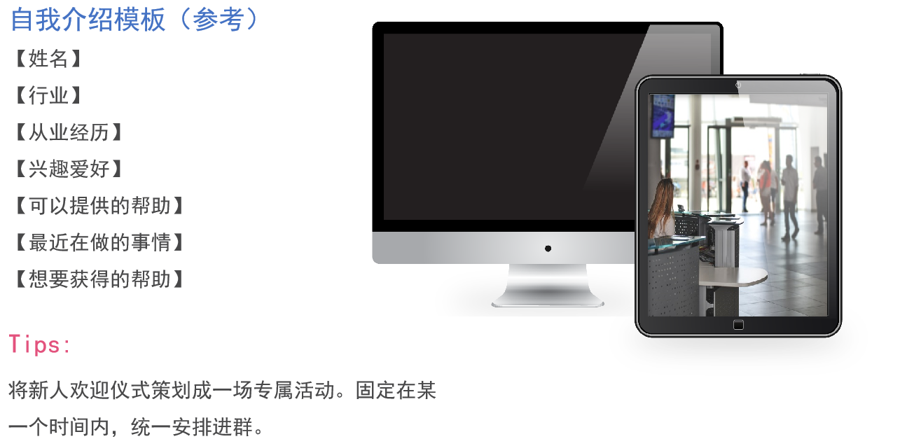 关于这部分,除了前文说过的关于新人进群的自我介绍,最好是有固定的模板,这样便于成员之间能够快速的认识彼此,找到共同话题。还有一个小技巧:无论我们的社群是准入制还是邀请制,最好是固定在某个时间段,统一安排进群。同时在新人进群前,群管理人员可以在群内先通知一下老用户,让大家知道,做好迎新准备。