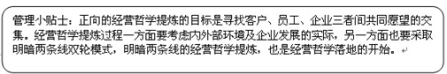 经营哲学是实施员工自主经营管理的基础,一个正向的经营哲学可以达到事半功倍的作用,一个负向的经营哲学,不但不能发挥好的经营导向作用,可能还有消极影响。科学的经营哲学提炼过程可以保证经营哲学的正向作用。科学的经营哲学提炼过程可分为两个阶段: