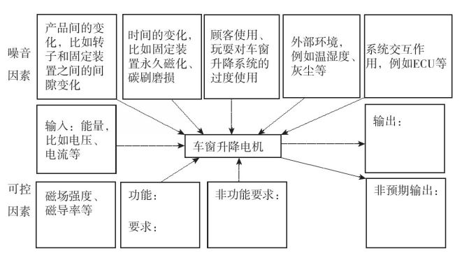 参数图的作用是实现系统、子系统的功能,识别影响功能的要素,包括可控因素、噪音因素、输入及非预期输出。参数图包括以下几个部分: