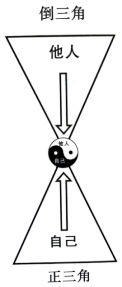 第二步,“一阴一阳之谓道”,人要学会与另一个人的相处,不管这人是自己的领导还是下属,是农民、消费者、代理商、竞争对手还是社会群体。当两个人,也就是两个三角形相遇时,就要结成一个正三角和倒三角在顶点处的结合。这个时候就要讲辩证法,学会一分为二、二合为一地看问题。单纯讲自己时,要把自己定位在正三角的最高点,自信且充满激情;面对别人时,要把自己定位在倒三角的最低点,尊重他人、谦虚谨慎。能做到这一点的,即使你再平凡,也是平凡人中的一个英雄。
