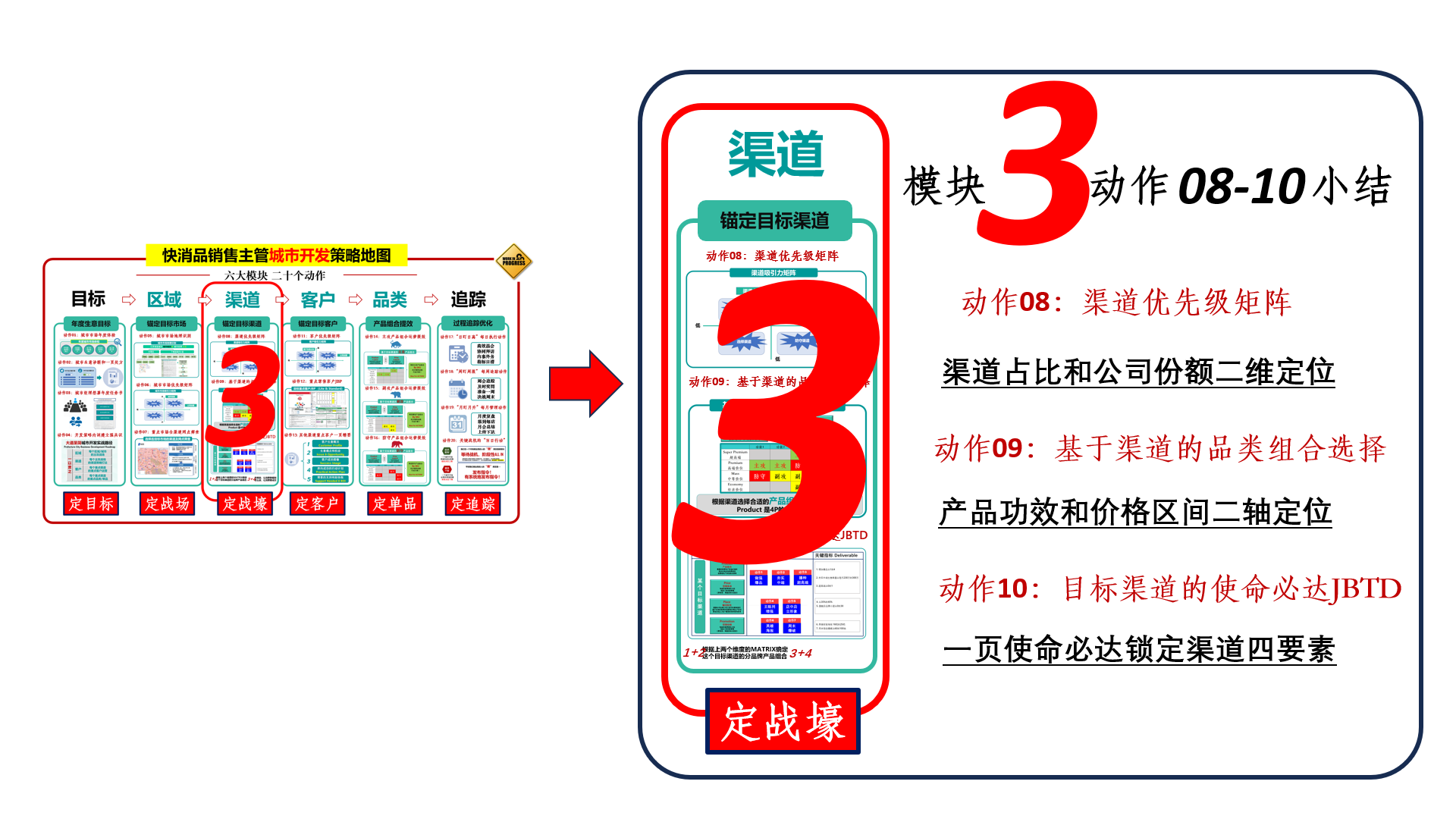 至此章节,“快消品销售主管城市开发策略”六大模块的第三模块——渠道“定战壕”相关内容的三个动作解析完毕,就让我们跟着老王的小结动作,回顾一下这个模块的主要内容要点吧!