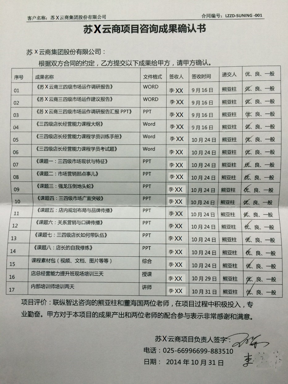 (2)让客户签收。让客户对接人签收你提交的成果,以表示收到。这个就有点投机取消的意思,因为让顾客正式的确认,除非你项目做的很好,或是对接人对你的成果特别了解,而有些没有能力分辨你的成果好坏的人,是不敢签字确认你做的好坏的,这样我们就让他签收,表示收到我们的某某文件,当然我们不会备注,如果在7日之内没有提出异议即表示认同。
