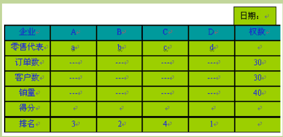 北京地区某饮料经销商利用独创的“看板管理”方法,将不同企业的零售代表管理得很好,并取得了不错的销售业绩。如表1-1所示,A、B、C、D代表四家企业,a、b、c、d代表四家企业的零售代表。经销商选择订单数、客户数和销量作为每个零售代表每天的考核关键指标,按每天不同的工作重点设置当天权重数,再排出各零售代表的当天业绩排名。